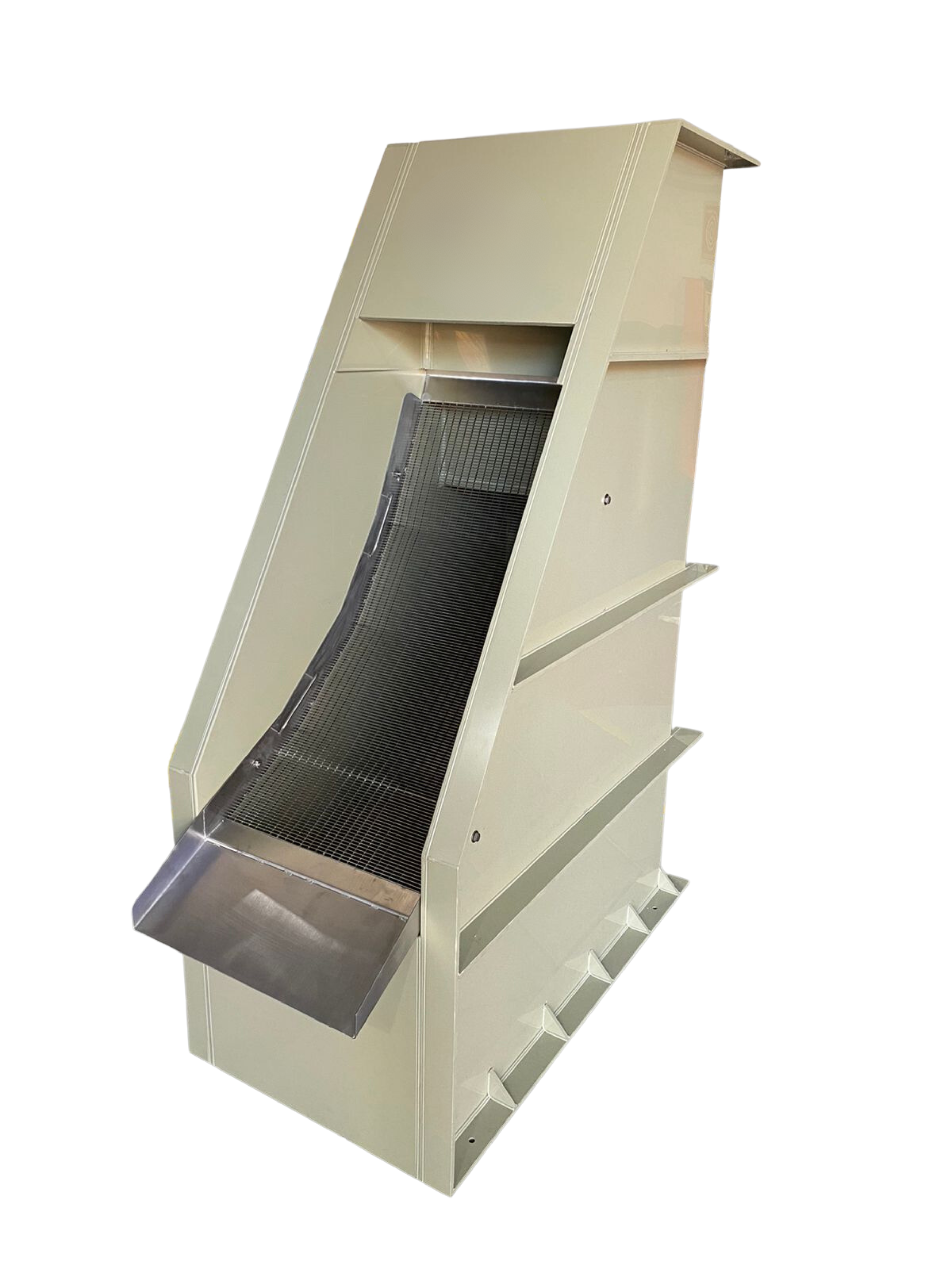 Equipamento responsável por promover a retenção de sólidos em suspensão presentes nos efluentes brutos. Equipamento com tela fabricada em aço inox AISI 304, dotado de um elemento filtrante de forma parabolóide em perfis trapeziformes. A remoção dos sólidos retidos e depositados na parte inferior do elemento filtrante é executada manualmente.